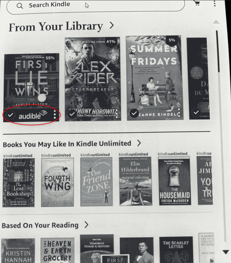 - Open the book from your library on the Kindle. Audible books are grouped under “Uncollected”.