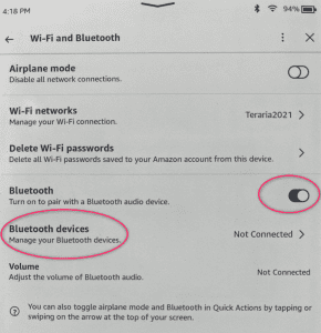 - The first thing you need to do is connect your Kindle to a bluetooth speaker. Go to All Settings>Wi-Fi and Bluetooth and make sure “Bluetooth” is turned on.